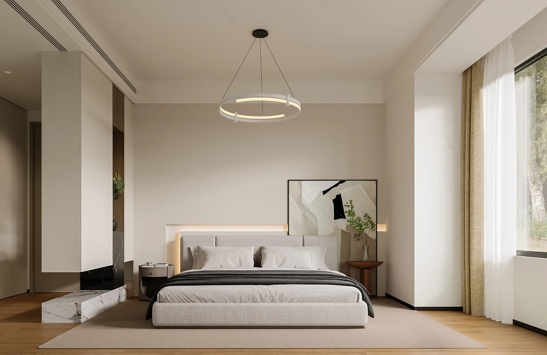 这间卧室以简约风为主,整体色调柔和温暖。一体化定制衣柜节省空间,床边小书桌满足睡前阅读或临时办公需求。大幅落地窗引入充足光线,窗外景致宜人。艺术吊灯增添氛围感,色彩搭配和谐,营造出舒适宁静又兼具功能性的睡眠与休憩空间