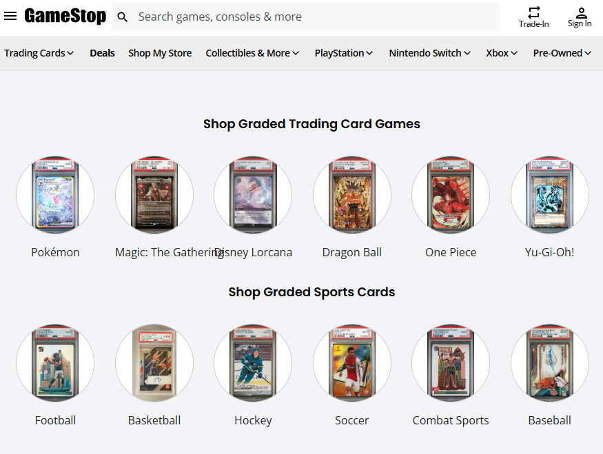 需要指出的是,PlayStation、Switch等平台的电子游戏并不是游戏驿站的唯一业务。在其官网上,“交易卡”(Trading Cards)的业务也占据了很大的版面。