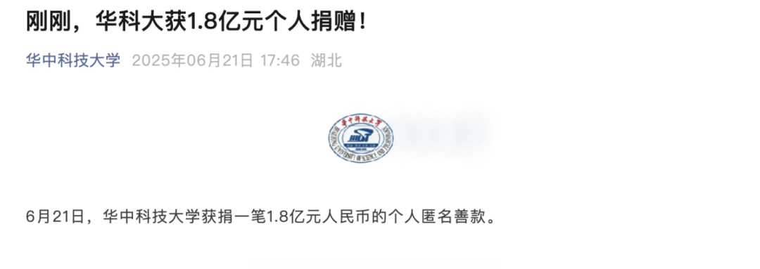 6月21日傍晚,词条“华中科技大学获1.8亿元匿名捐赠”冲上微博热搜。