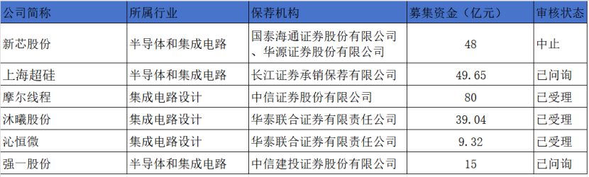 此外,上交所网站显示,6月30日,新芯股份更新了上交所科创板IPO审核状态为“中止(财报更新)”。国泰海通证券和华源证券为其保荐机构,拟募资48亿元。