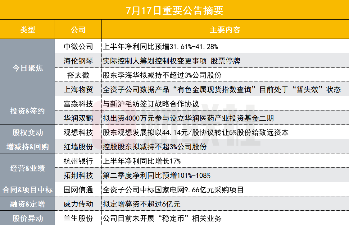 净利同比最高增超40%!1100亿芯片股披露半年报预告|盘后公告集锦