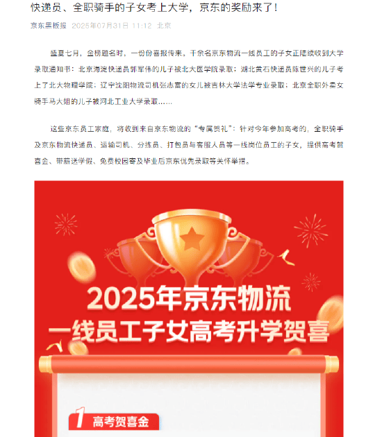 京东奖励全职骑手、京东物流快递员等一线员工子女考上大学:高考贺喜奖金,发放3天带薪假,毕业后优先录取