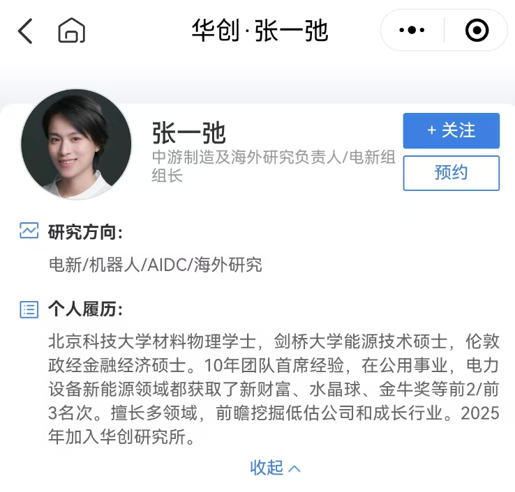 记者查询“华创证券研究”微信公众号发现,张一弛的名字和简历已经出现,她的职务是中游制造及海外研究负责人、电新组组长,方向是电新、机器人、AIDC、海外研究。