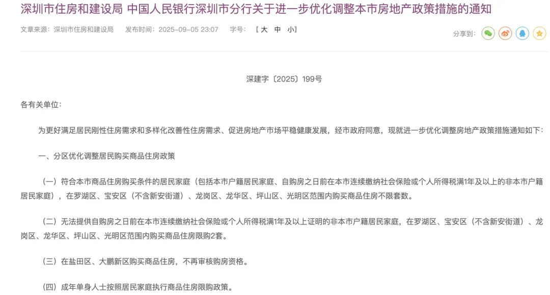 深圳市住建局、中国人民银行深圳市中心支行联合发布房地产新政,在购房资格、企业购房限制、房贷利率三方面打出组合拳,自9月6日起正式施行。