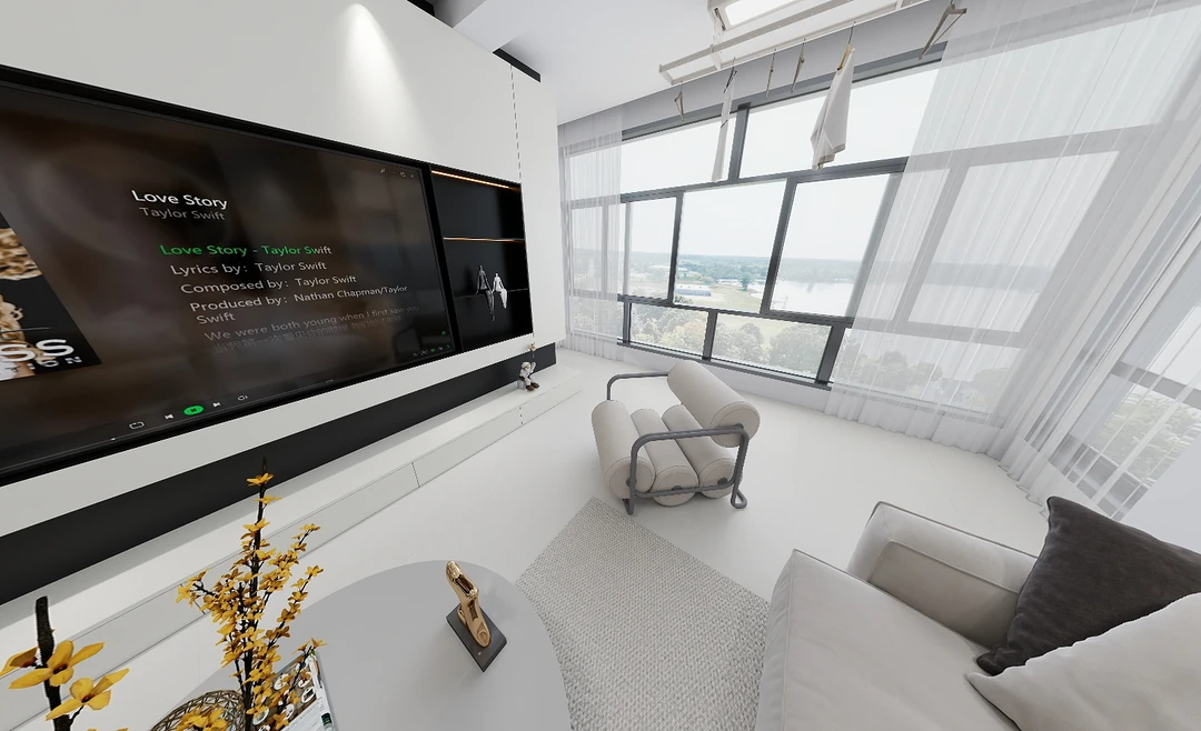这个客厅空间宽敞明亮,大窗引入充足采光与美景。大屏幕电视适合观影娱乐,简约沙发与单椅提供舒适坐感,营造放松居家氛围。整体以白色为主色调,搭配浅灰软装,尽显简约现代风格,是日常休闲放松、享受惬意时光的理想之所