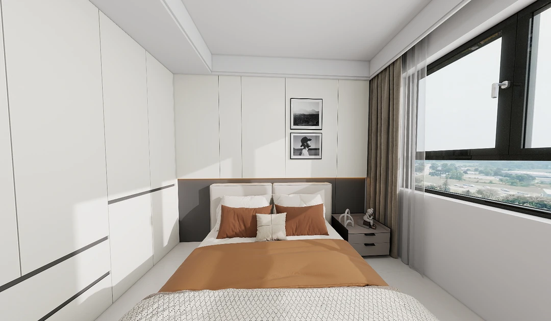 这是简约风格卧室。空间上,定制衣柜与床一体化设计,节省空间又实用。生活上,窗边光线好,可惬意赏景。色彩以白为主,棕色床品点缀,温暖舒适。两幅黑白挂画增添艺术氛围,整体简洁大方,既满足收纳需求,又营造出宁静放松的睡眠环境