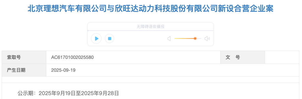上海市场监督管理局9月19日的公示信息显示,创立近30年的老牌锂电企业欣旺达电子股份有限公司(下称“欣旺达”,300207.SZ)旗下的欣旺达动力科技股份有限公司(下称“欣旺达动力”)与北京理想汽车有限公司(“北京理想”)将以50:50的出资比例成立合资公司。