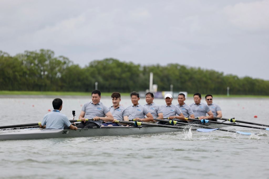 9月24日,在中国赛艇协会原副主席、上海赛艇公开赛赛事总监、也是胡兵在国家队时的教练李建新的带领下,胡兵与队友们重聚淀山湖。刚见面,他们就熟稔地聊起往事,从住过的宿舍到昔日年轻人们追求时髦的装扮,队友情一如往昔。作为2025世界赛艇锦标赛推广大使,胡兵与队友们共同划起八人单桨赛艇。