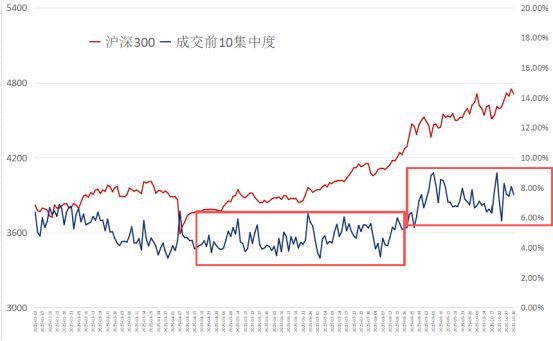 这里有张图,从2019年至今,虽然行情高点不一定反映出偏高的交易集中度,但是偏高的交易集中度基本都对应着行情阶段高点。
