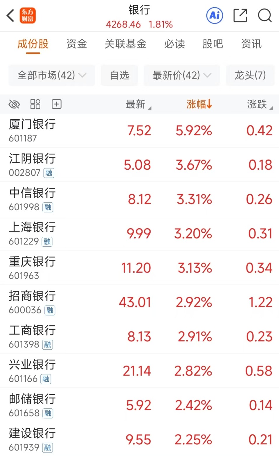 尤其银行股,全天基本处于领涨状态,指数盘中一度涨近2%。收盘时,厦门银行涨超5%,江阴银行、中信银行、上海银行、重庆银行涨超3%。工商银行、建设银行等大行也涨幅靠前。