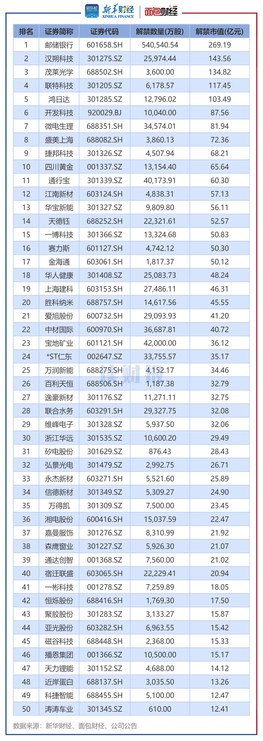 逾2600亿元限售股3月解禁邮储银行、汉朔科技解禁规模居前